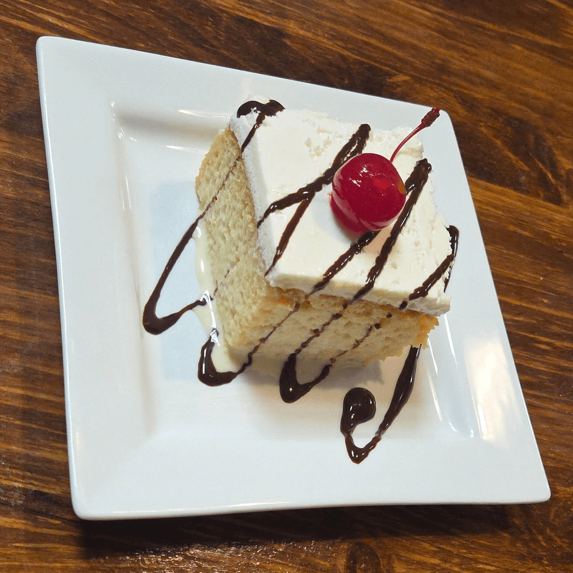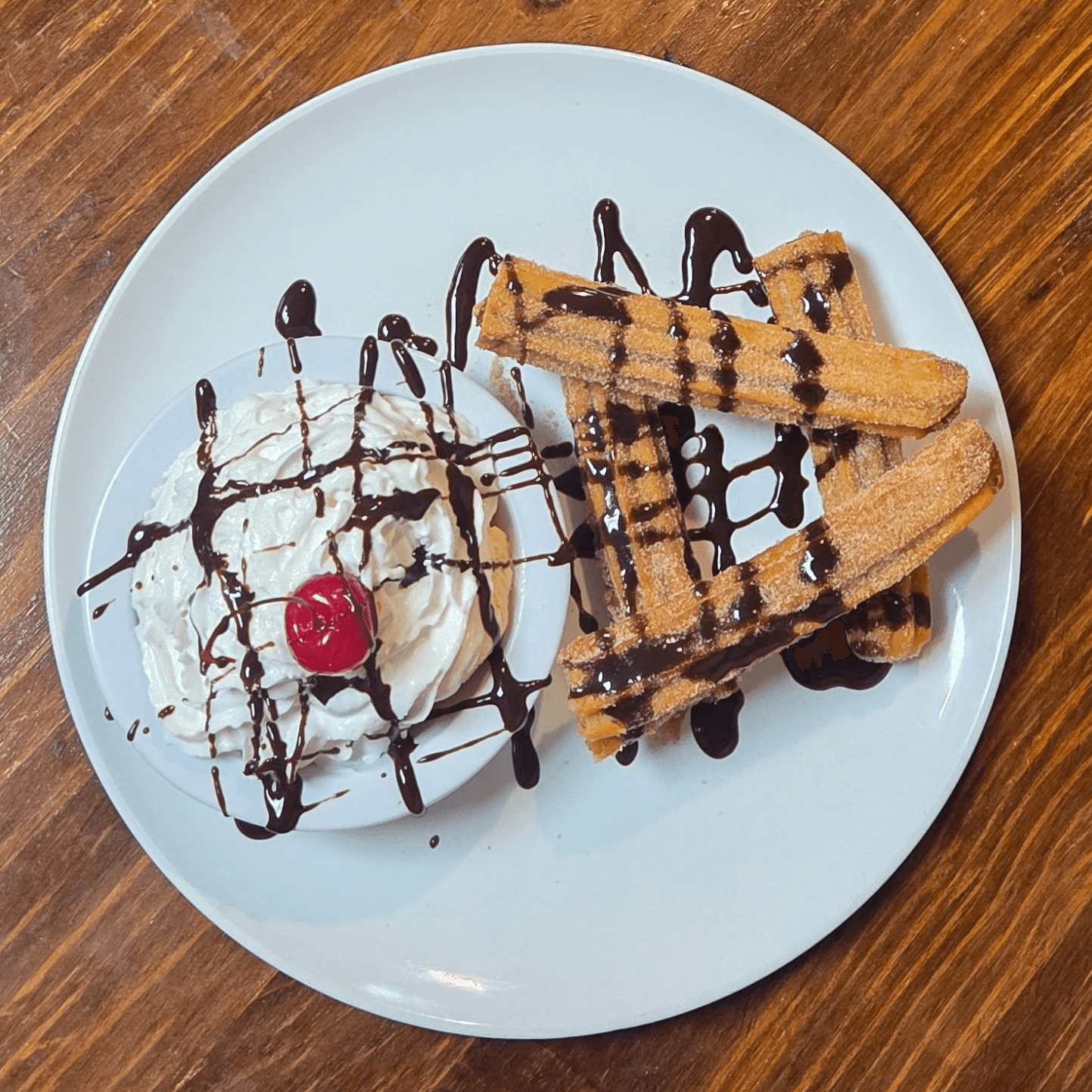 Flour tortilla filled with apple cinnamon and spikes, served with a scoop of vanilla ice cream, topped with strawberry sauce and whipped cream.