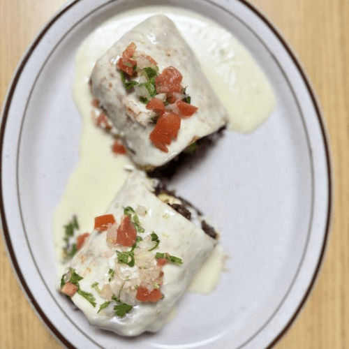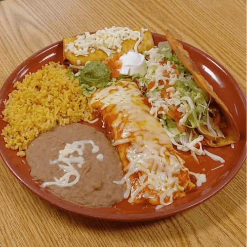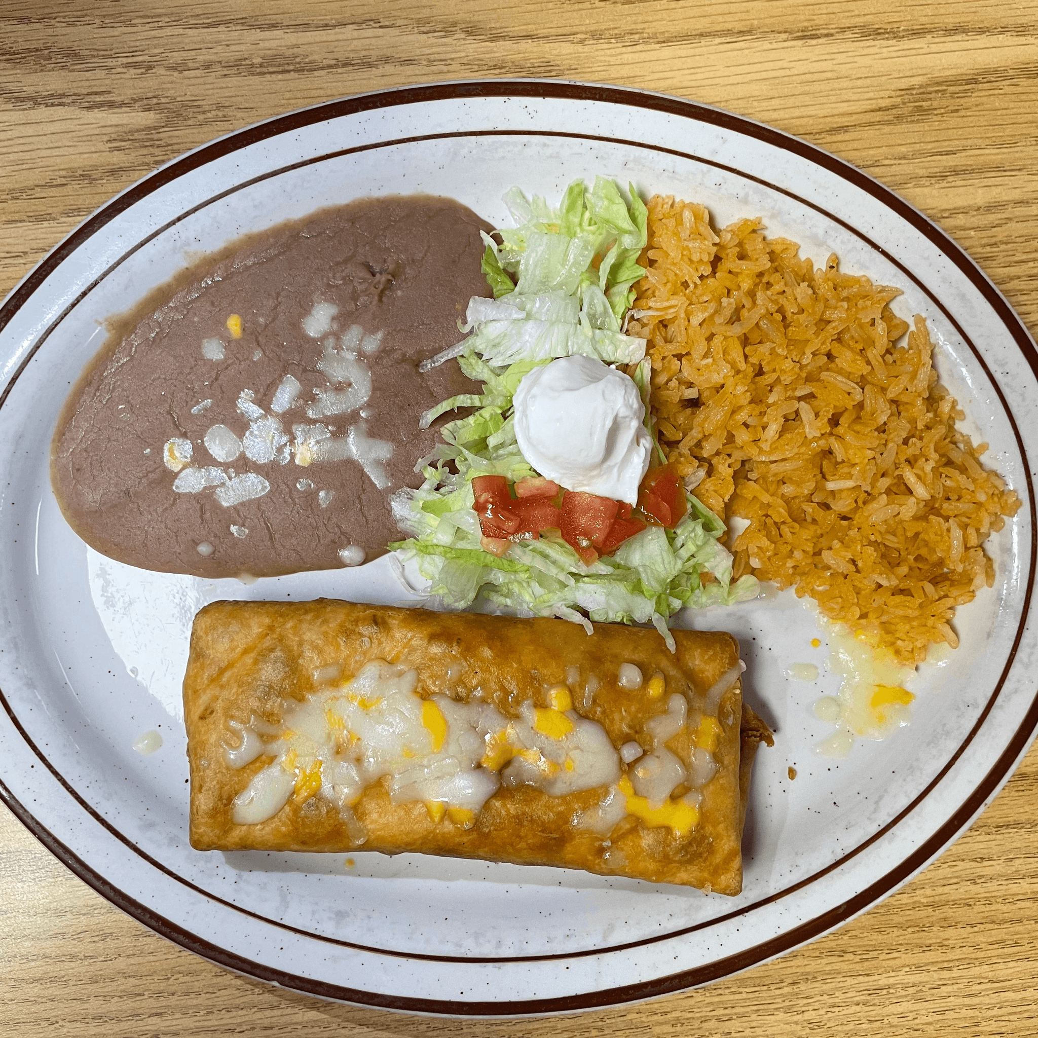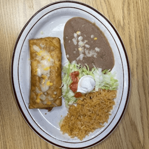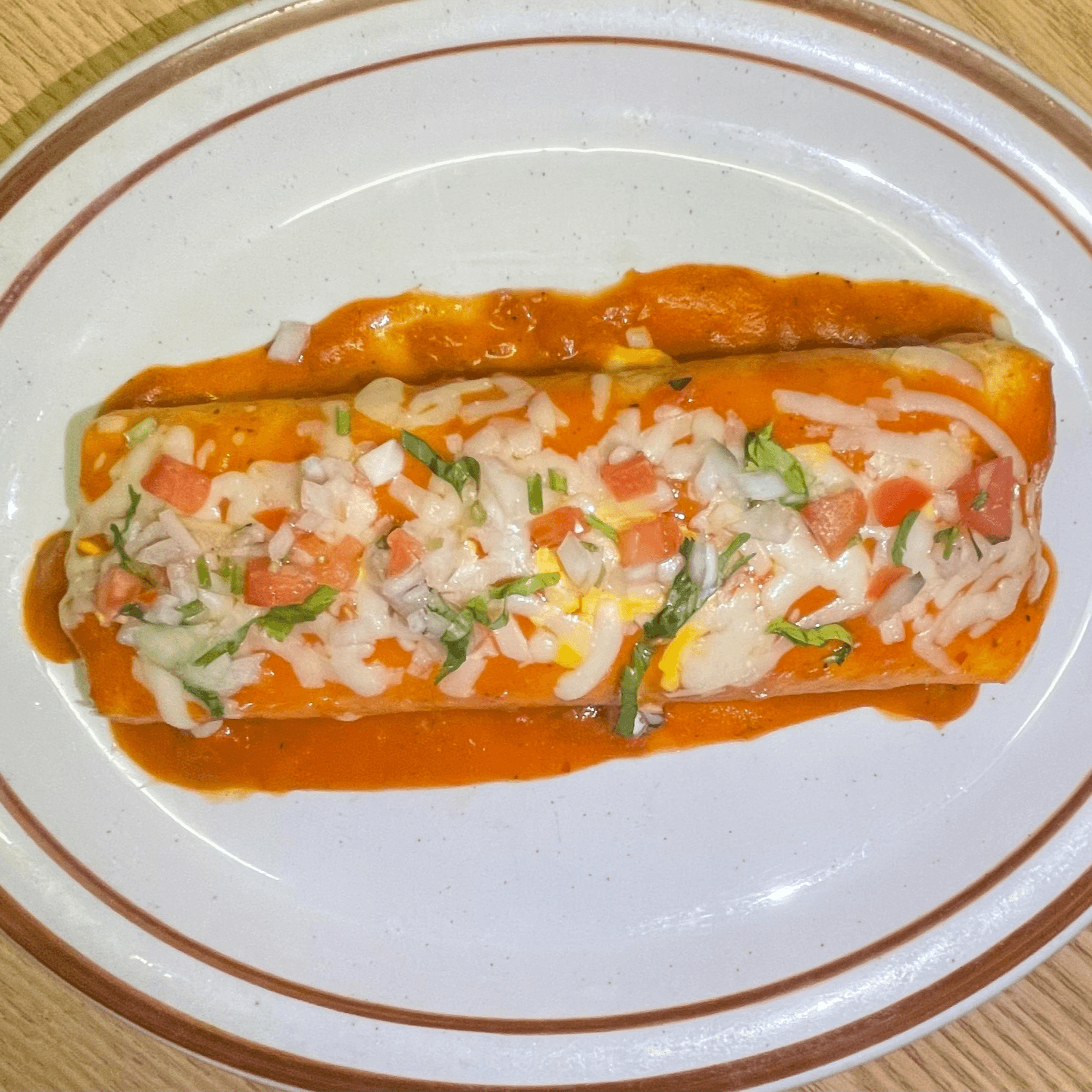 Flour tortilla filled with Chile relleno, Mexican rice, beans, topped with salsa ranchera and garnished with lettuce, tomatoes and cotija Mexican Cheese.