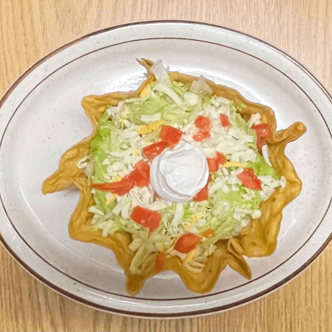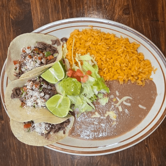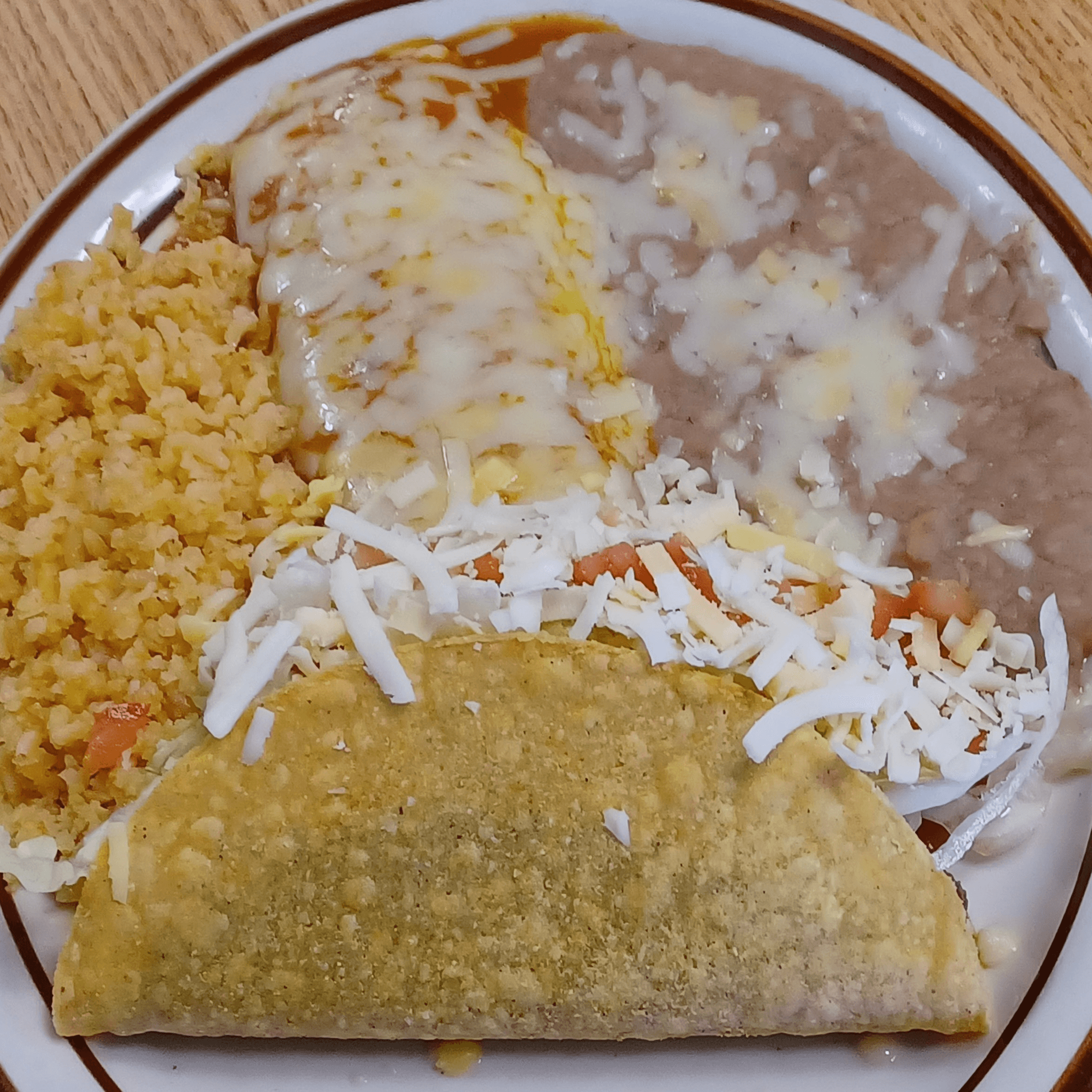 A crispy flour tortilla filled with your choice of ground beef, chicken, or picadillo (Shredded beef and pork), topped with lettuce, cheese, and tomatoes. Served with rice and beans.