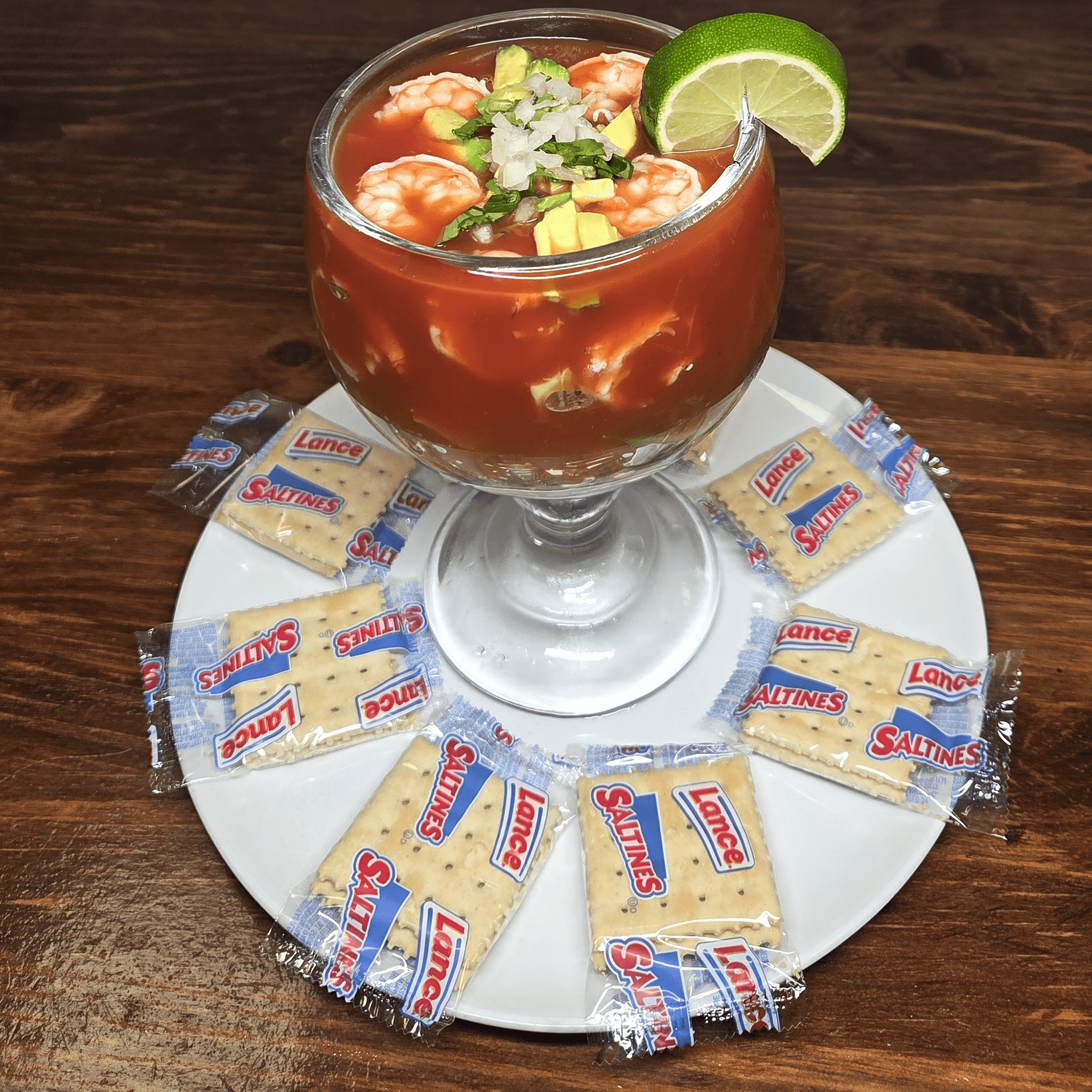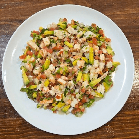 Shrimp cooked with lemon, blended with chopped tomatoes, avocado, and cilantro.