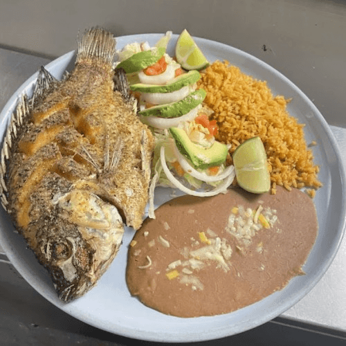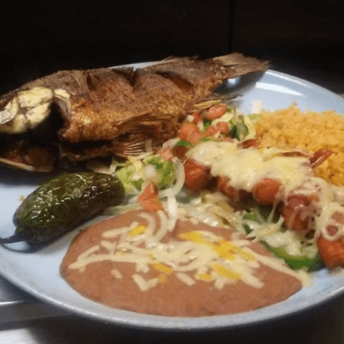 Whole Fried tilapia fish and shrimp wrapped with bacon. Served with rice and beans.