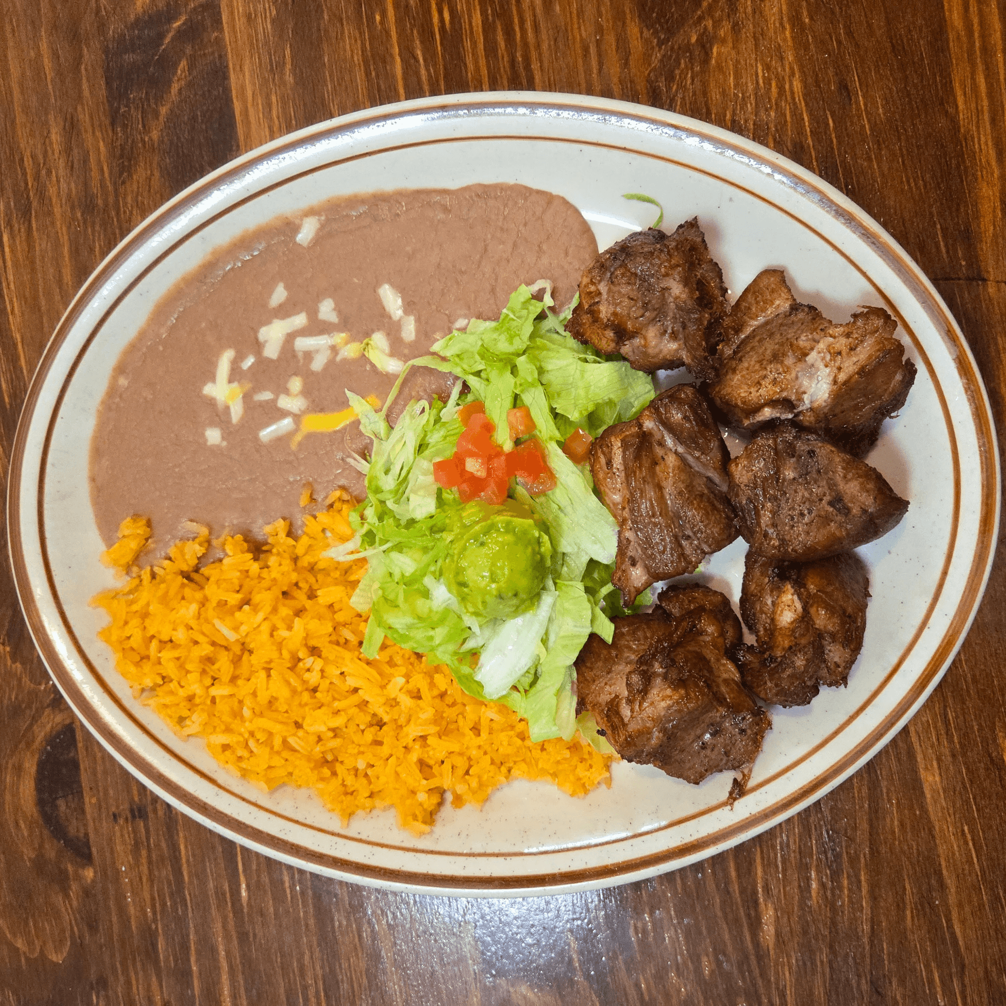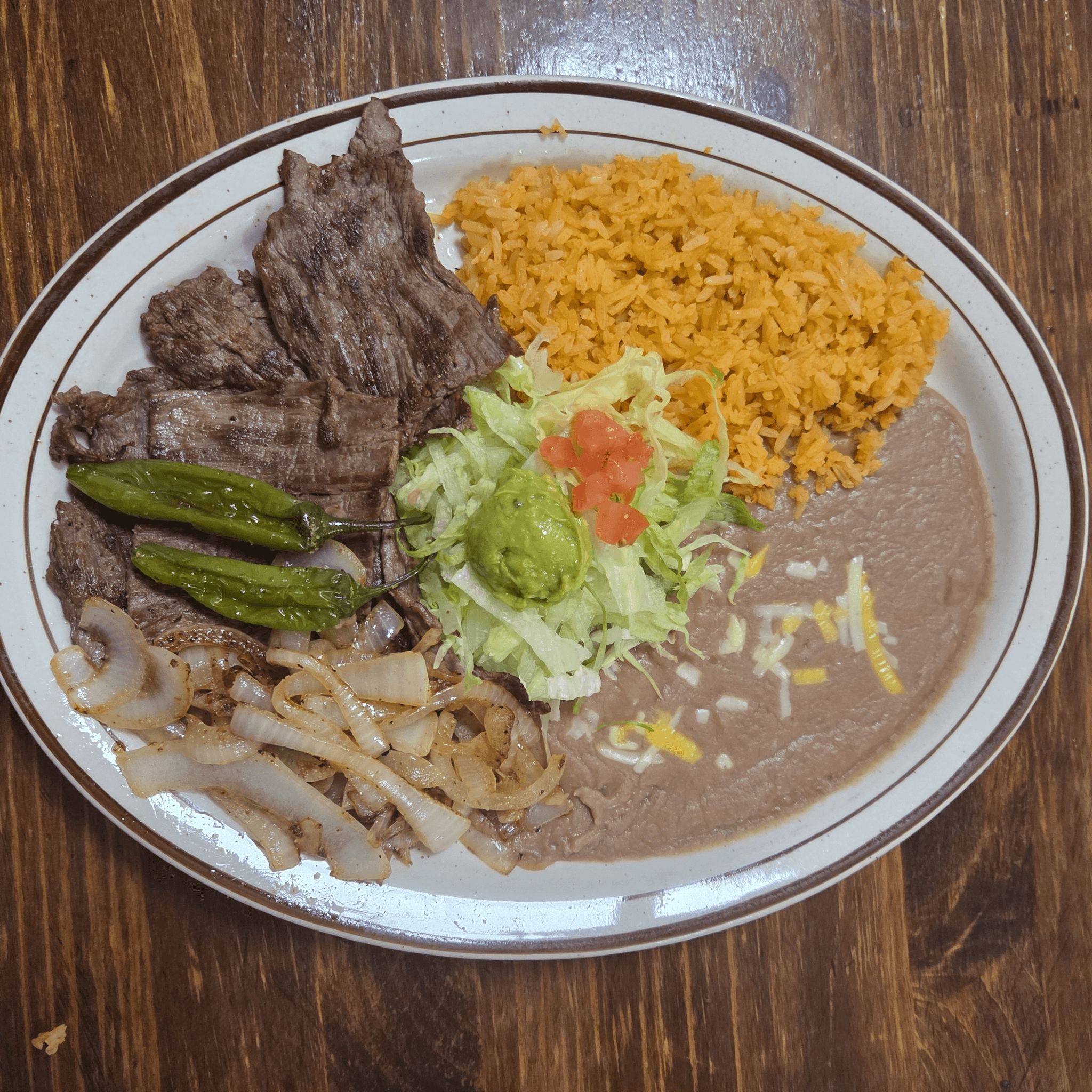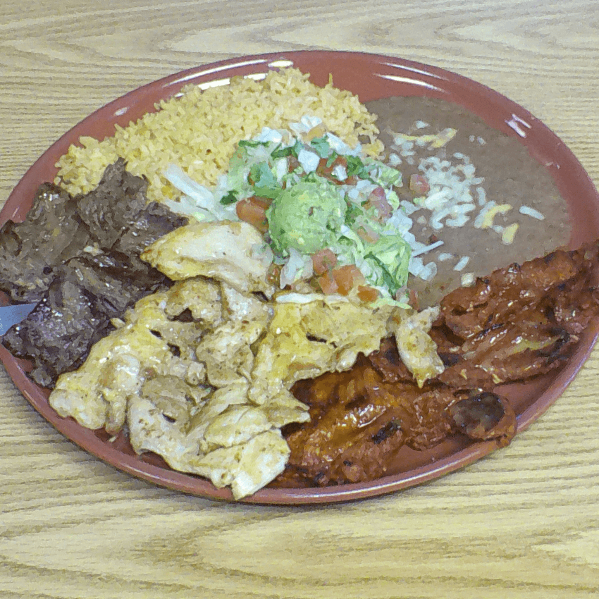 8 oz Fillet of Steak, Chicken, and Pork char-broiled, chorizo Grilled Mexican Sausage. Served with rice, beans and guacamole.