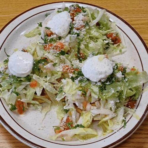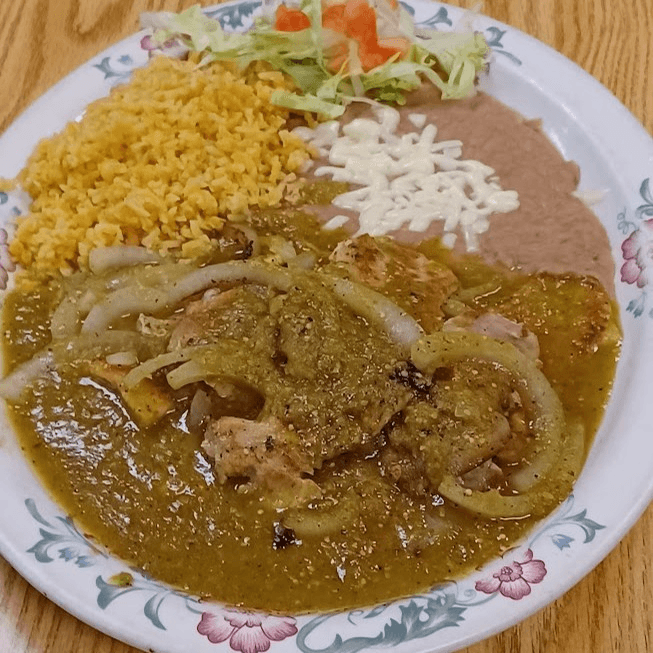 Two corn tortillas stuffed with your choice of cheese, chicken, ground beef, or picadillo, topped with delicious green tomatillo sauce and melted Monterey Jack cheese, garnished with sour cream.