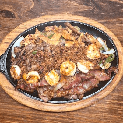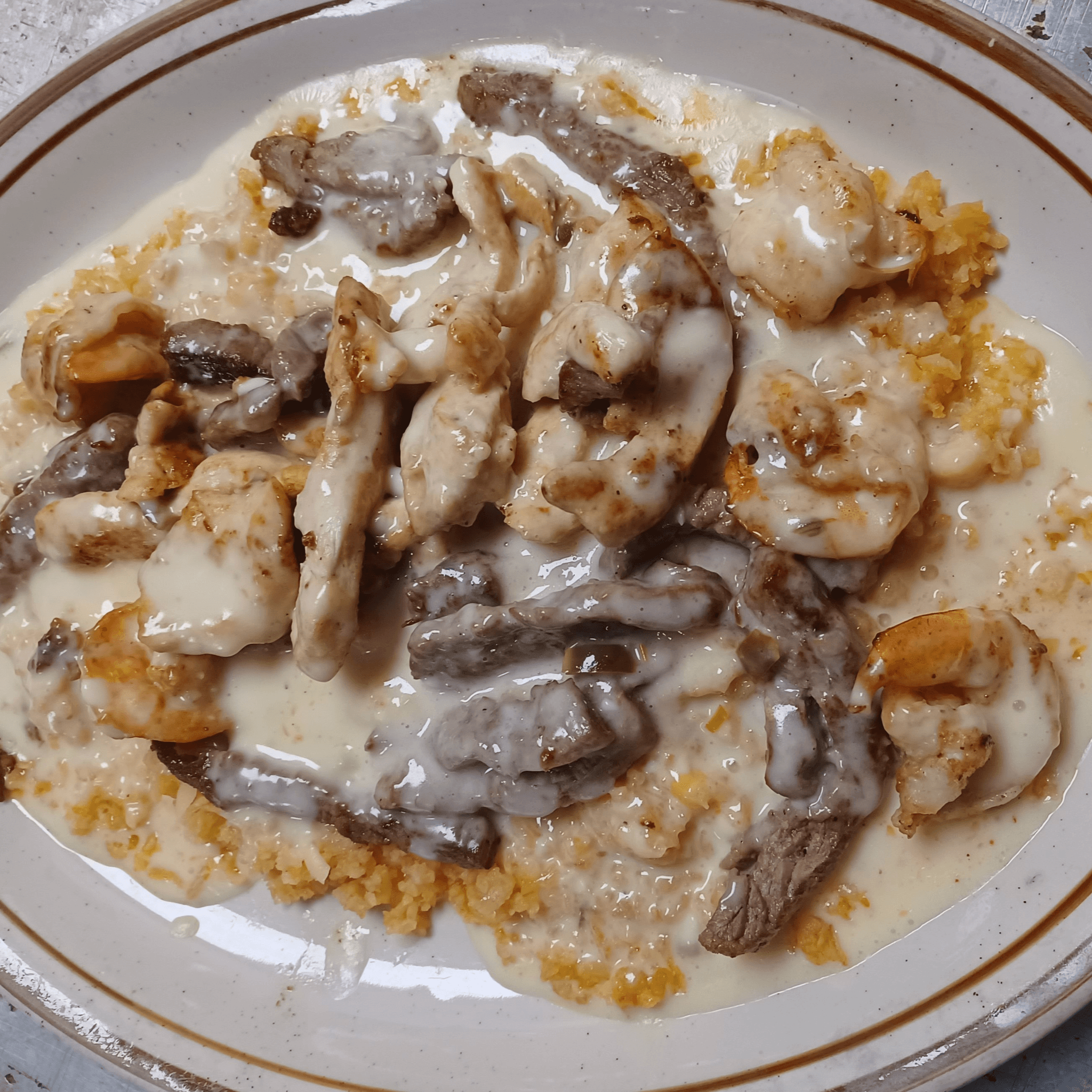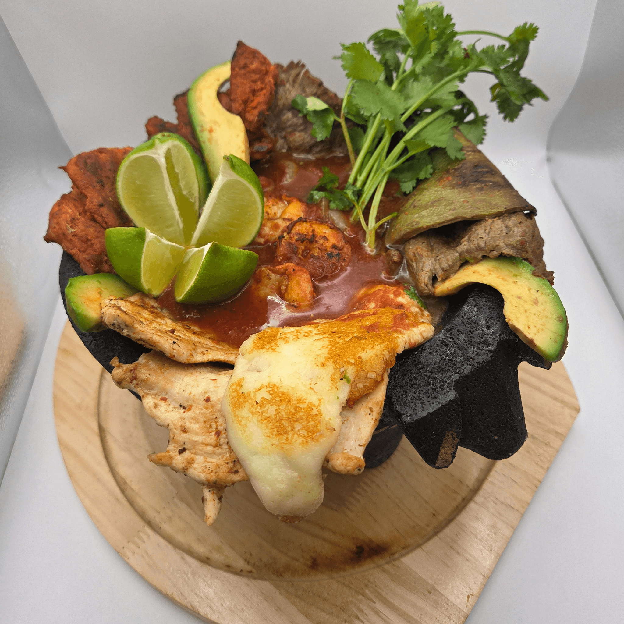 Strips of Steak, Chicken and shrimp, bacon, grilled chorizo (Mexican Sausage) cooked with tomatoes, onions and bell peppers topped with cheese sauce. Served with guacamole salad, rice beans and three flour or corn tortillas.