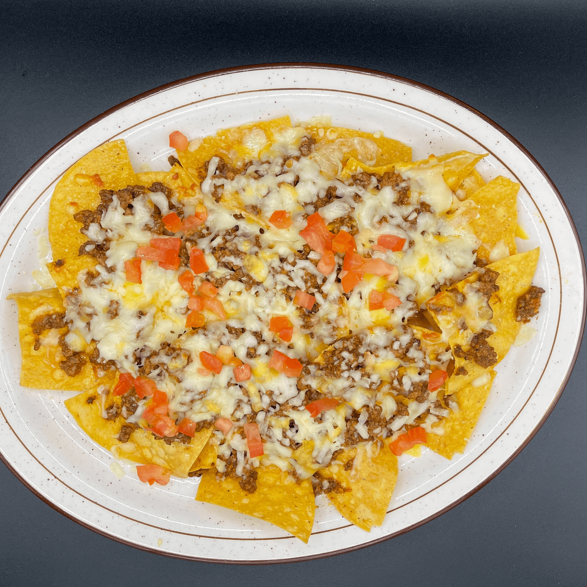 Fresh Crispy Tortilla Chips with Hot melted Cheddar Cheese, garnished with tomatoes, jalapenos available upon request.
