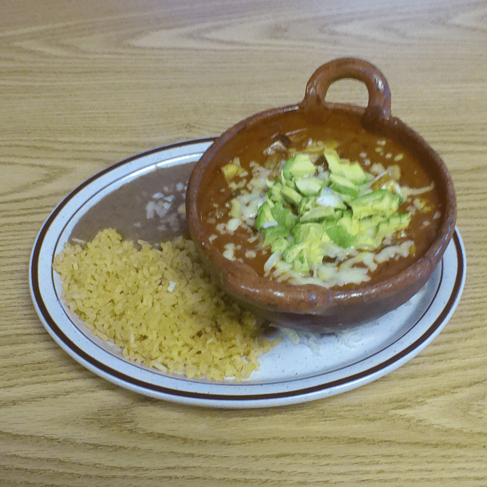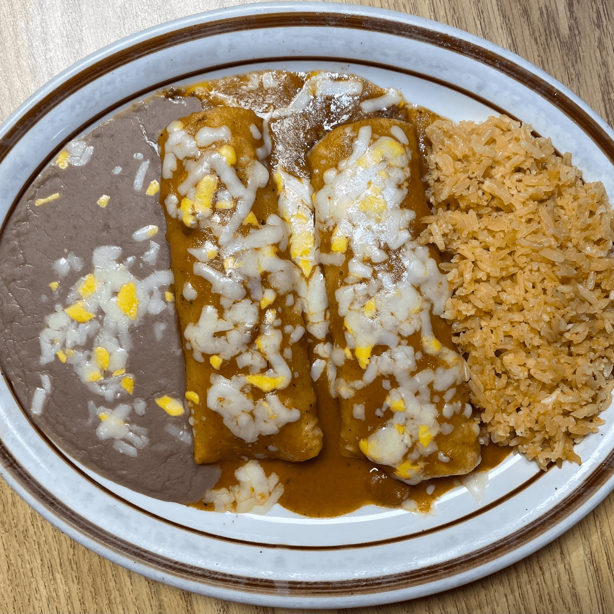 Two Corn tortillas stuffed with chunks of chicken, ground beef, or picadillo and smothered in our authentic Mexican mole sauce.