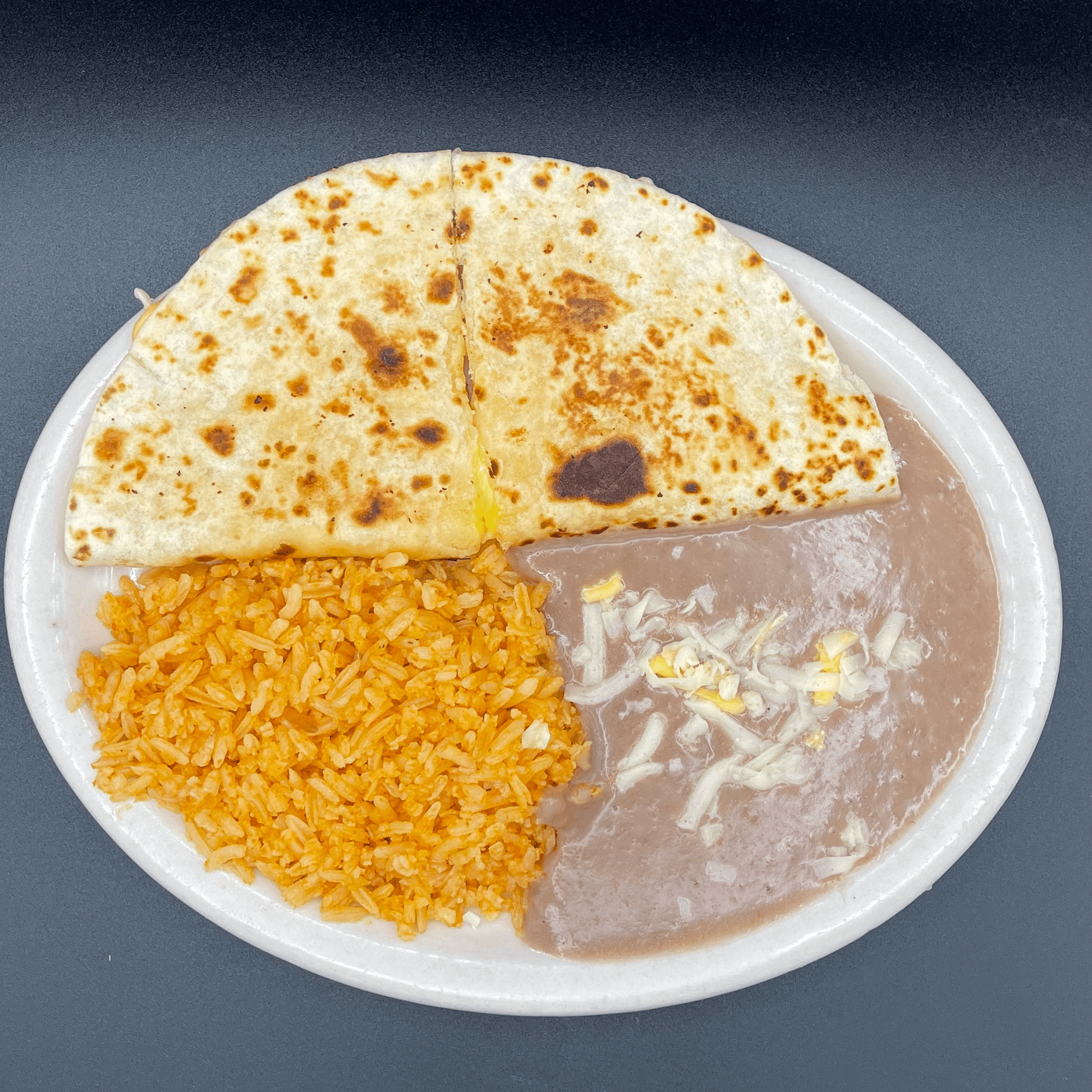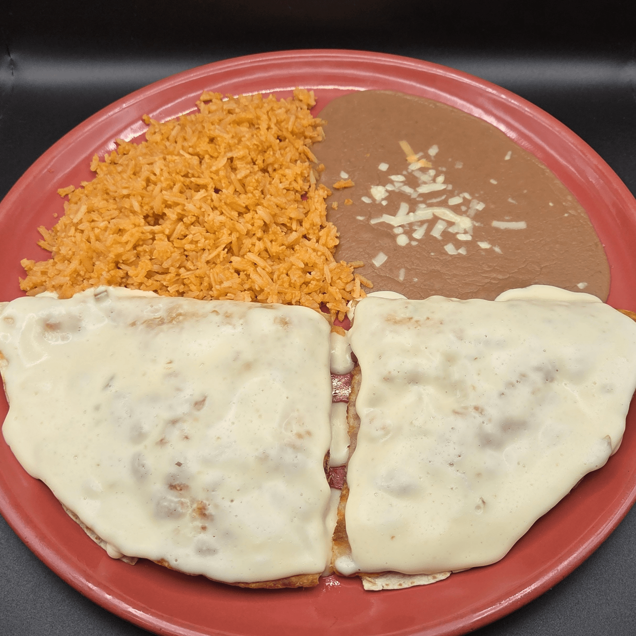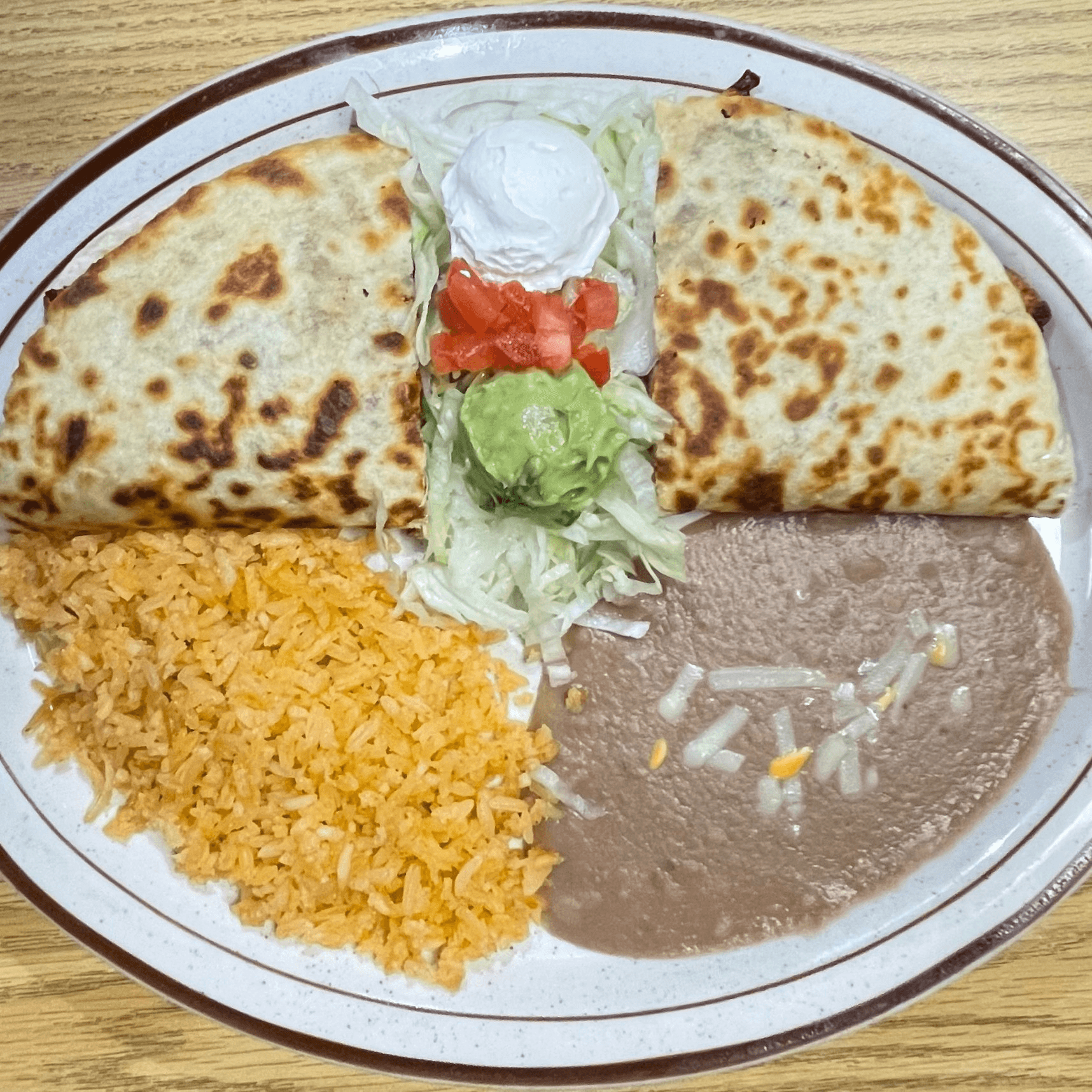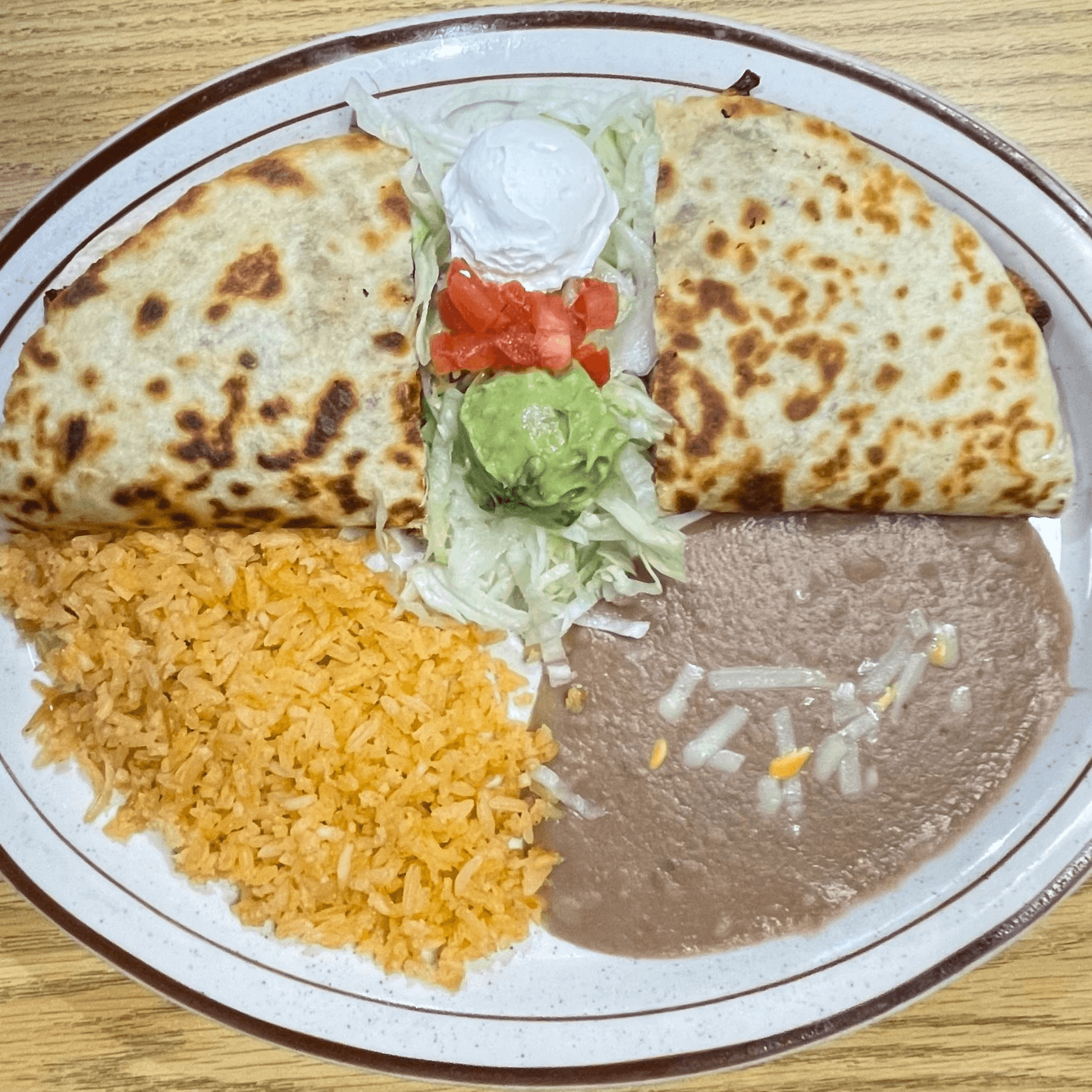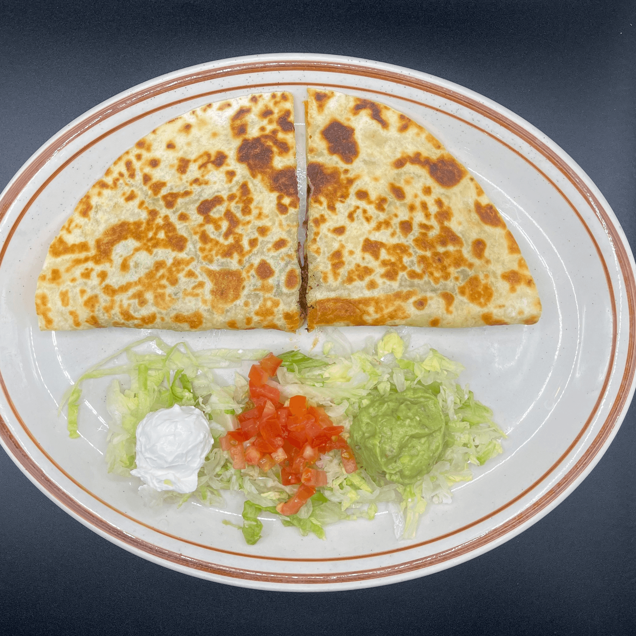 One Crispy Flour tortilla stuffed with Cheddar and Monterey Jack Cheese and Your Choice of Chicken, Ground Beef, or Picadillo. Served with onions, Tomatoes, Sour Cream, and Guacamole.