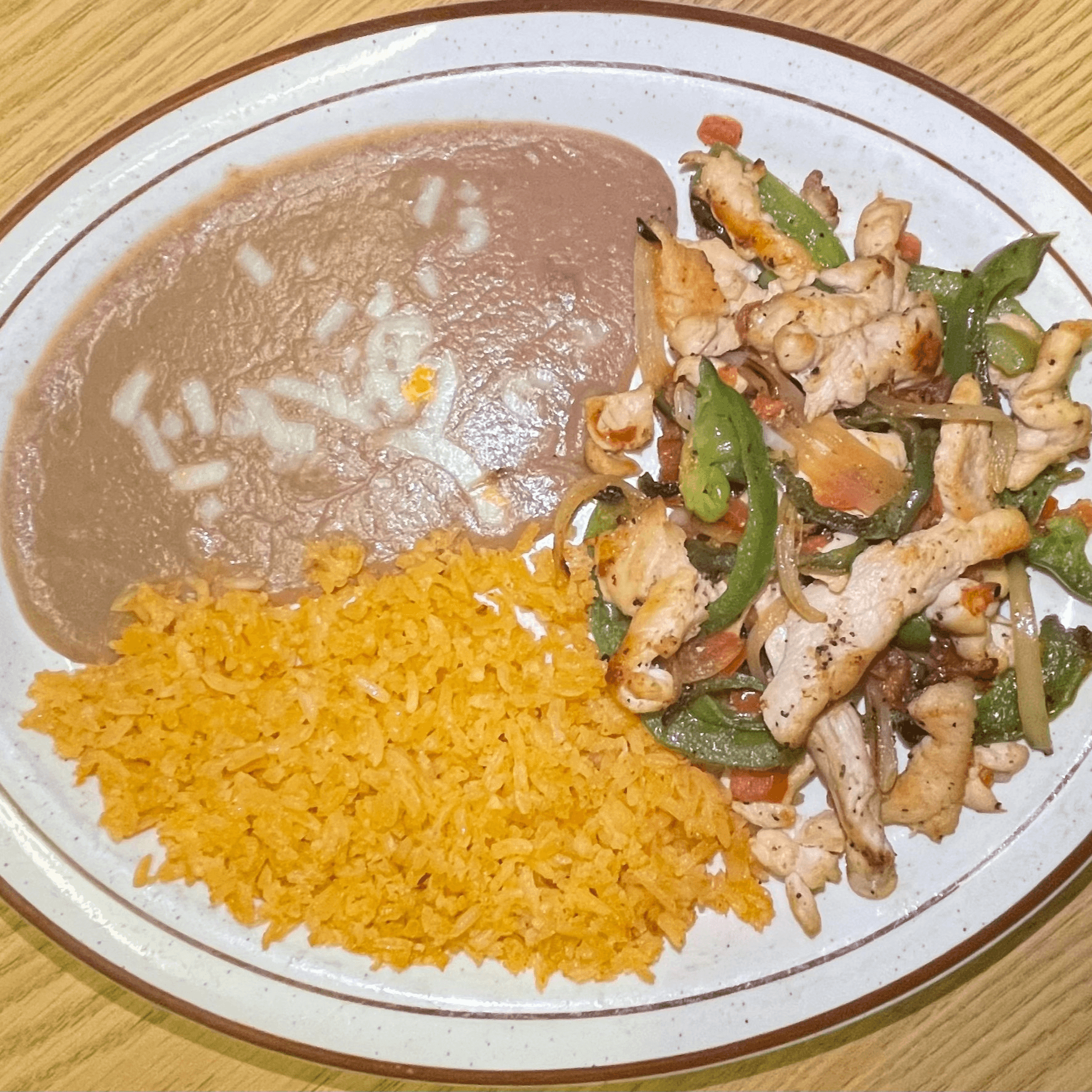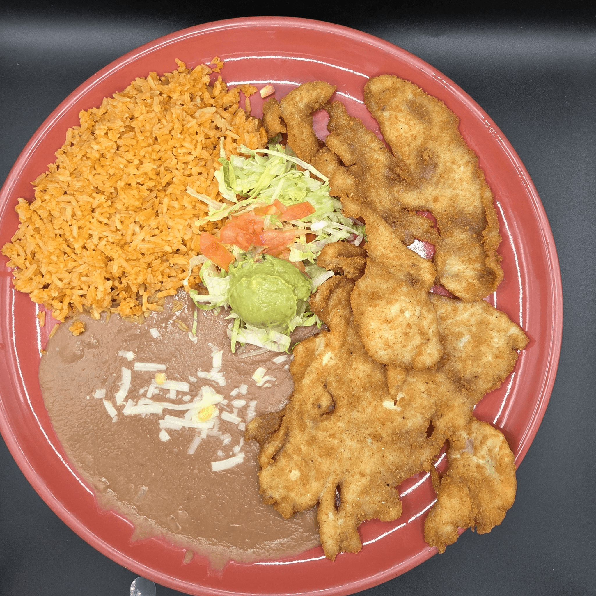 Filets of skirt chicken breast topped with chorizo cheese sauce. Served with rice and beans.