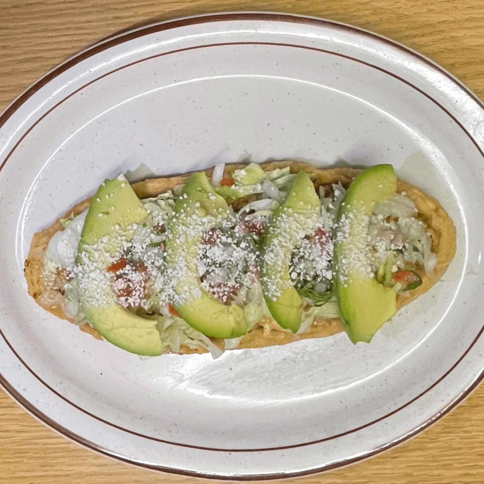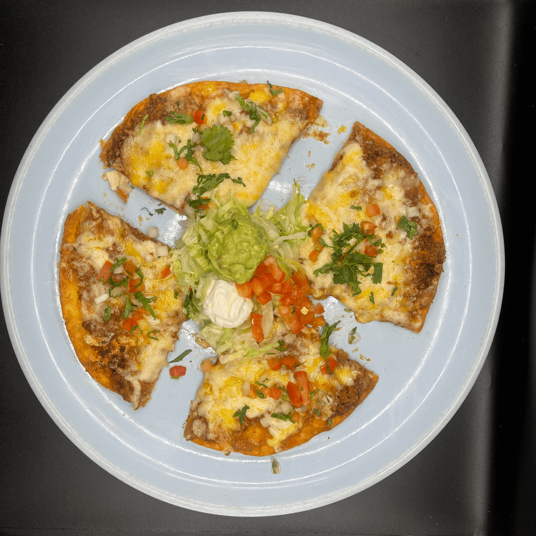 Crisp Flour tortilla with your choice of refried beans, Monterey Jack and cheddar cheese, tomatoes and green onions garnished with sour cream and guacamole, Includes your choice of Chicken, ground beef or Picadillo.