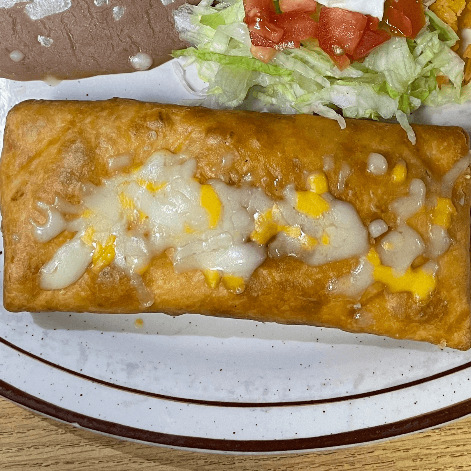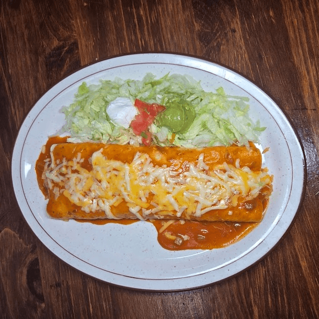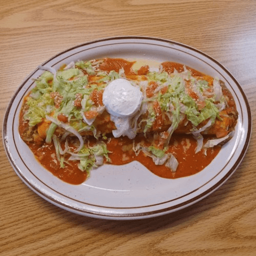 A super burrito! A flour tortilla filled with Mexican rice, refried beans and your choice of ground beef, chicken, pork, picadillo. Your burrito is then smothered with burrito sauce and cotija Mexican cheese and garnished with fresh lettuce, tomatoes and sour cream.