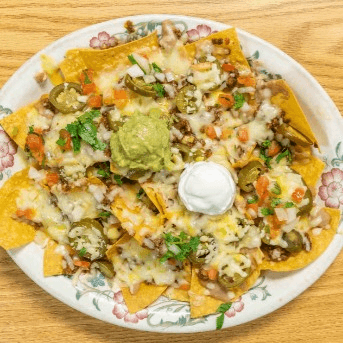 Crispy cheese nachos with your choice of ground beef, chicken or picadillo (shredded beef and pork).