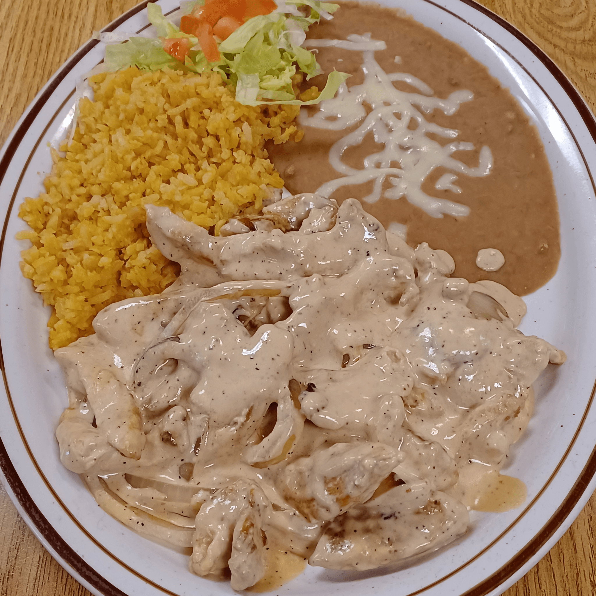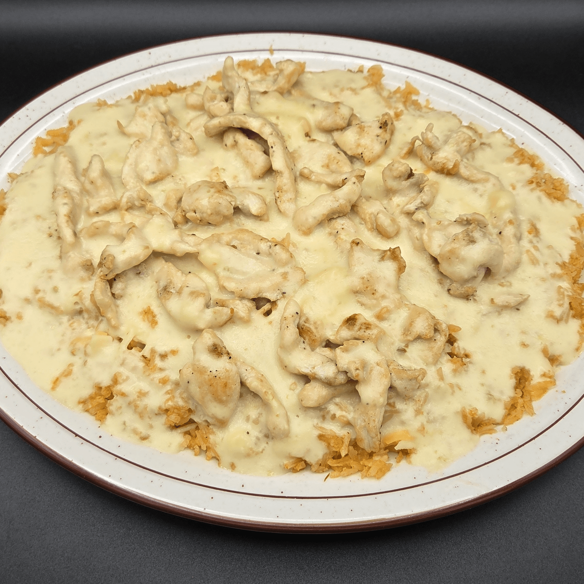 Strips of chicken breast sauteed with onions and topped with a delicious creamy cotija Mexican cheese sauce.