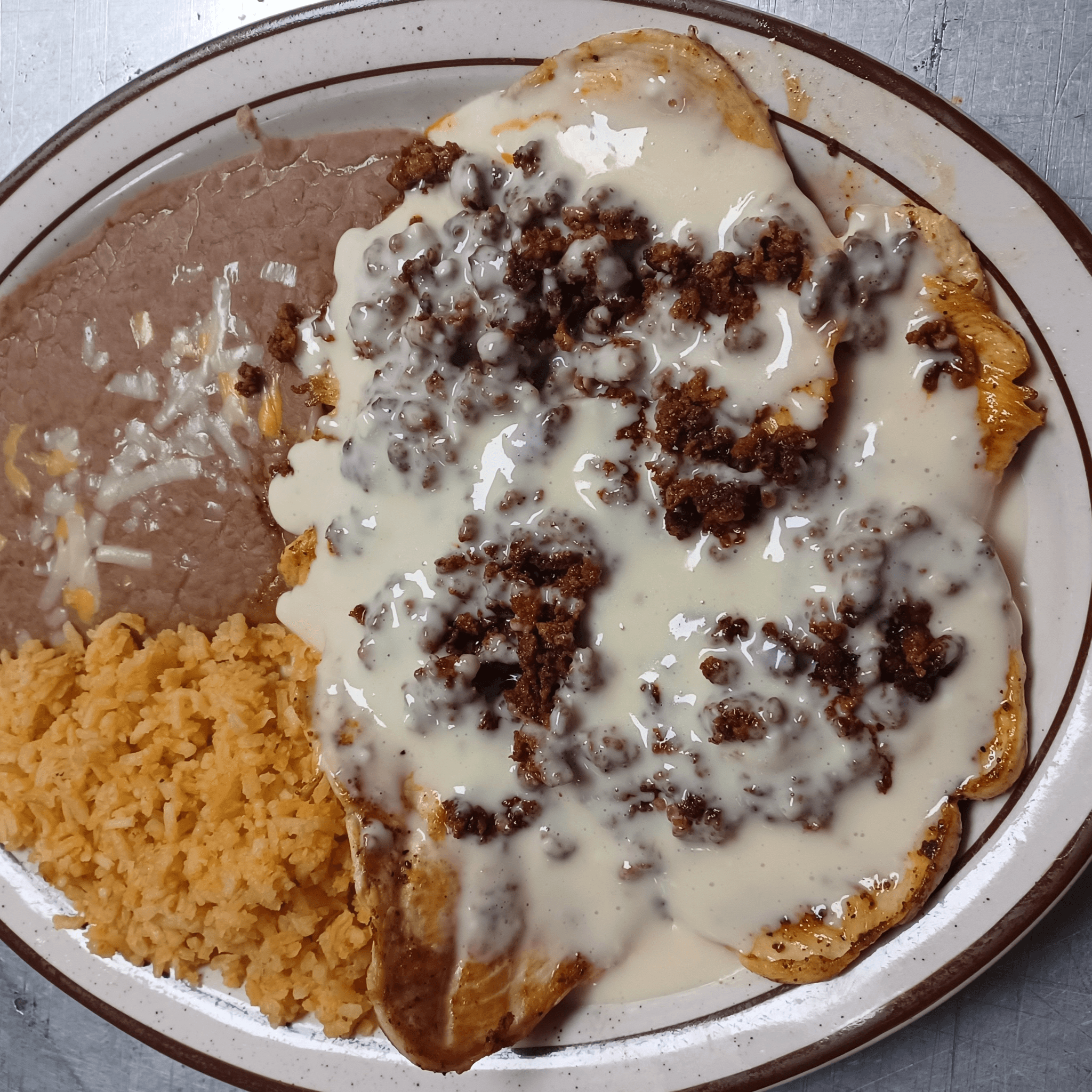 Two Corn tortillas filled with your choice of cheese, chicken, picadillo or ground beef, topped with fresh ranchera sauce and sour cream.
