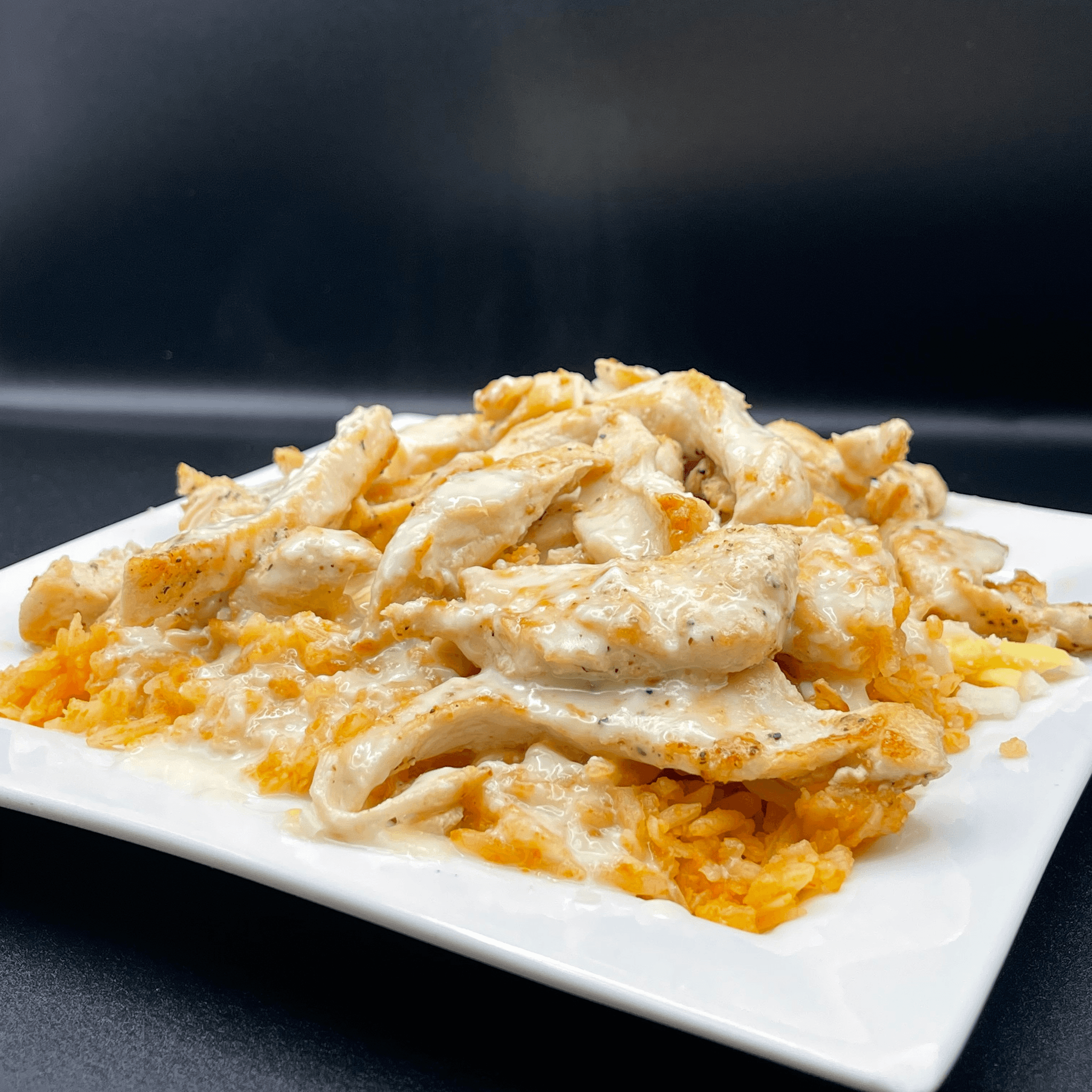 Grilled chicken strips over a bed of Mexican rice topped with our cheese sauce.