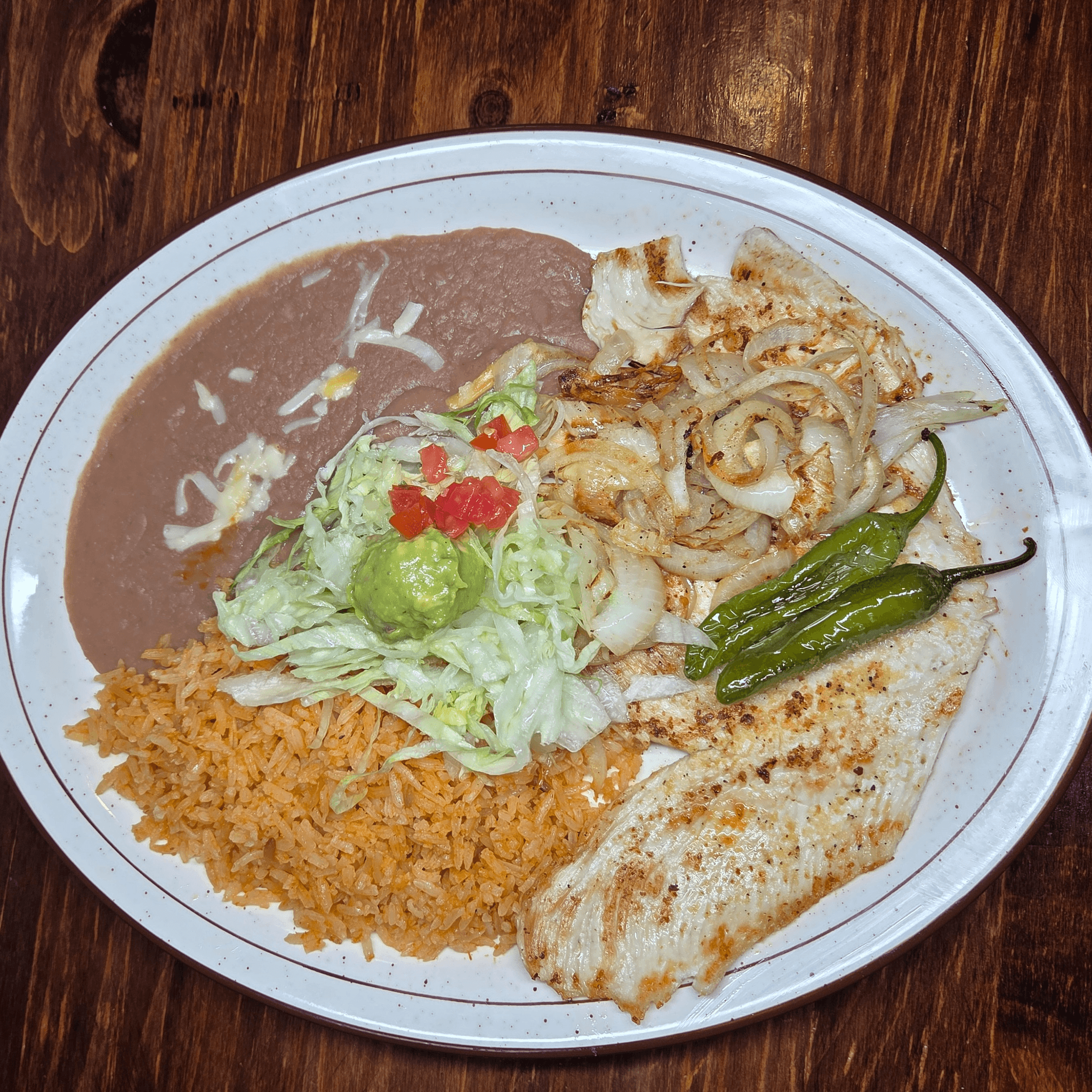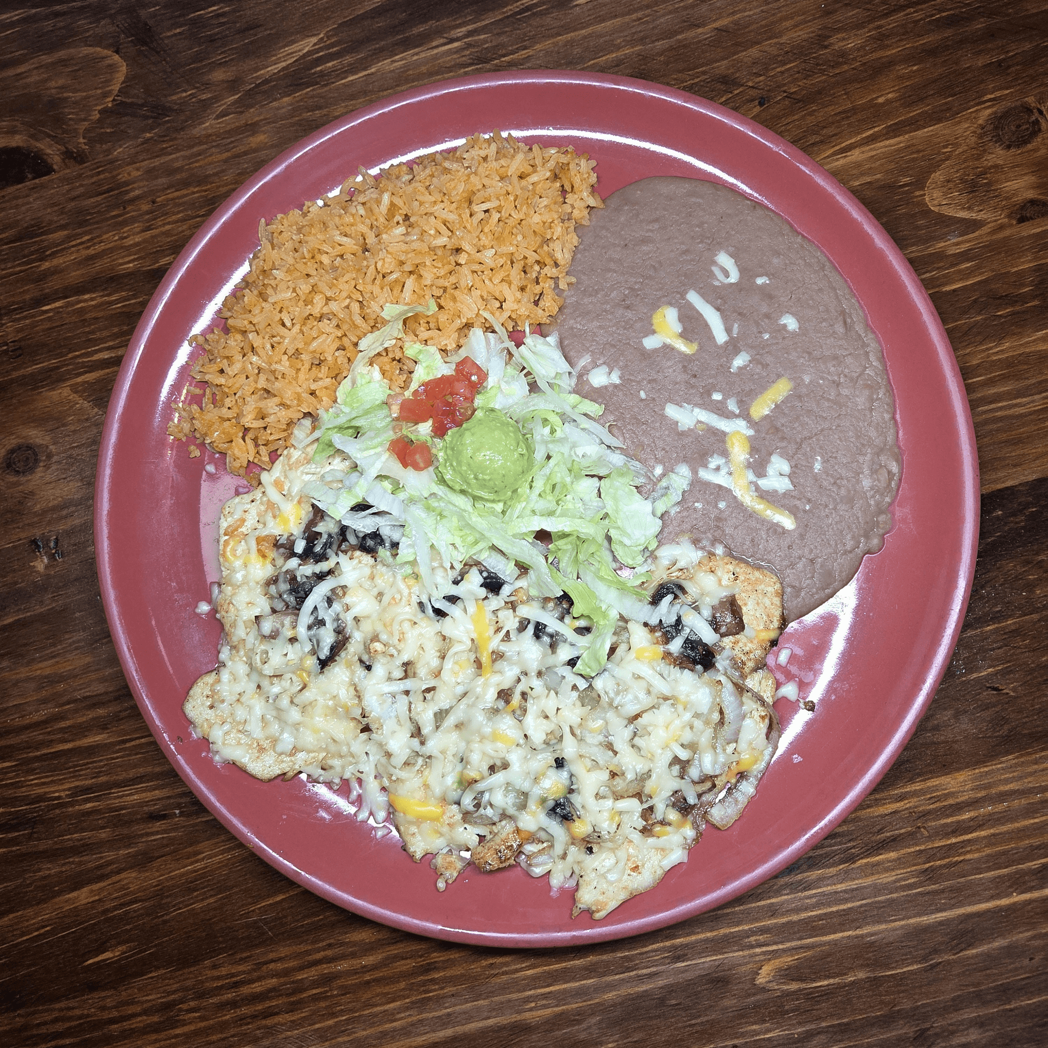 Fillets of skirt chicken breast, topped with onions, mushrooms, and cheese. Served with rice, beans, and guacamole.