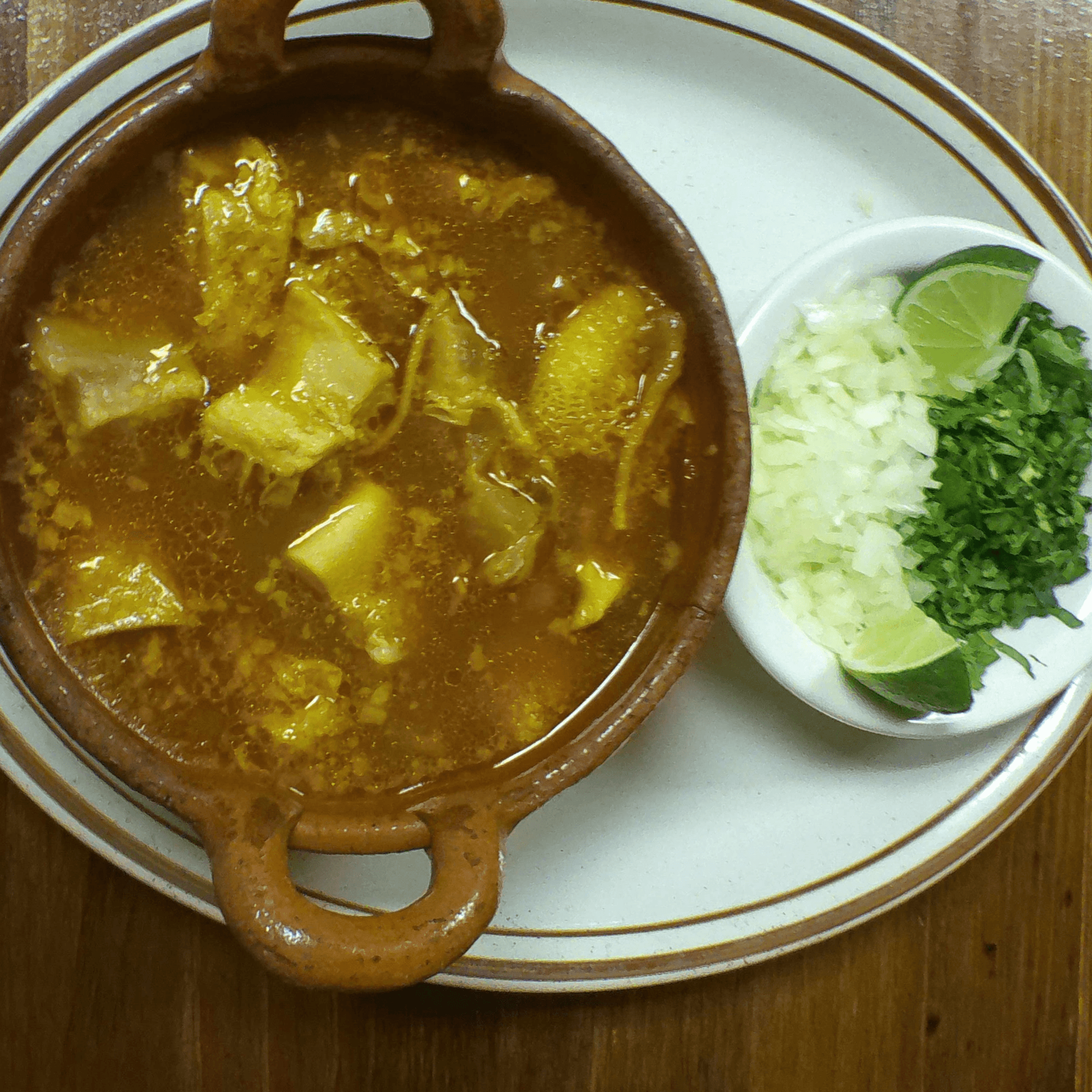 A traditional Mexican Dish, beef belly, served with cilantro, onion, and tortillas.