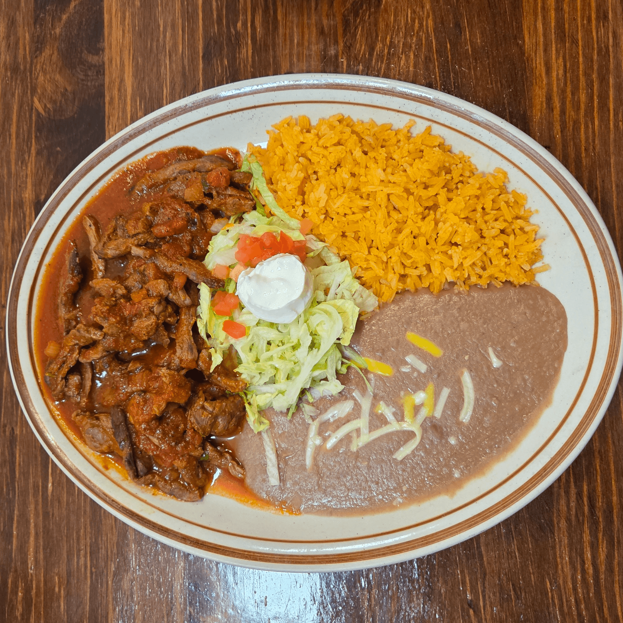 Chunks of Steak. Cooked in a mild red chile sauce.