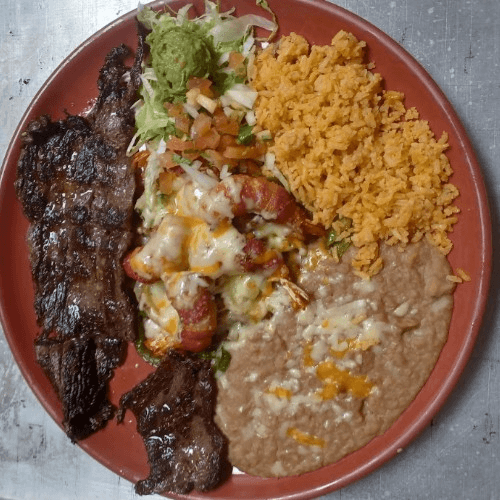 Grilled skirt steak and bacon-wrapped shrimp served with rice, beans and pico de gallo.