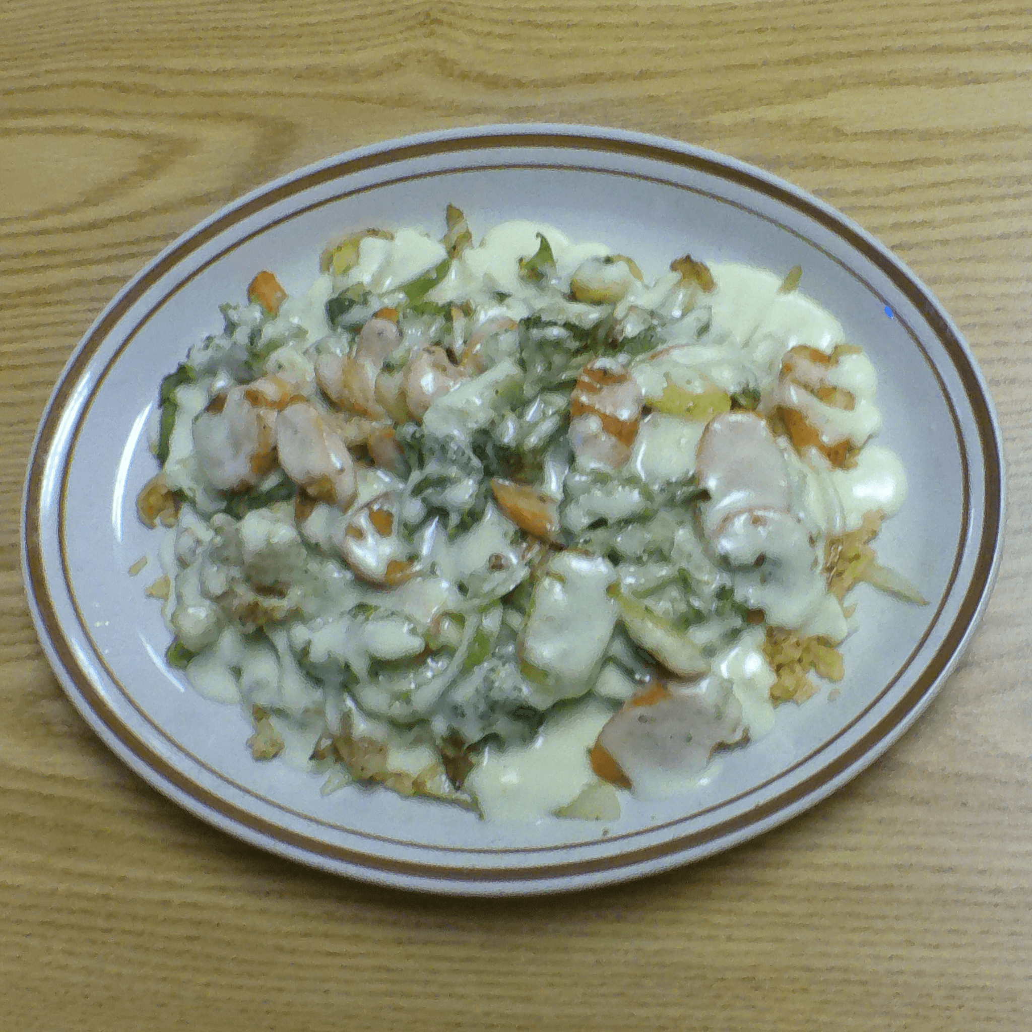 Grilled carrots, mushrooms, broccoli, zucchini, squash, onions and bell peppers, covered with cheese sauce.