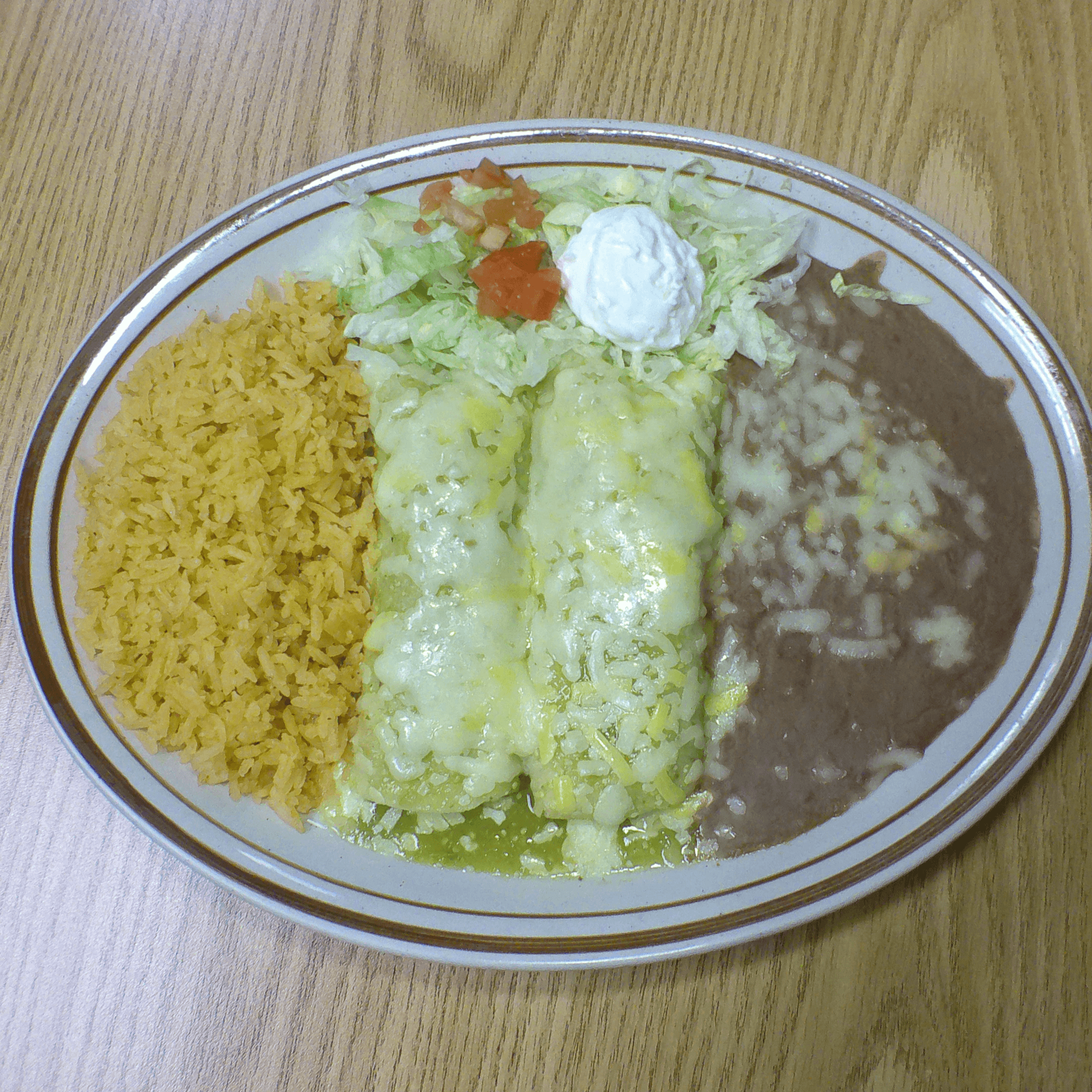 Chopped Spinach, blended with cheese, rolled in two corn tortillas, topped with green sauce and melted cheese, rice and beans.