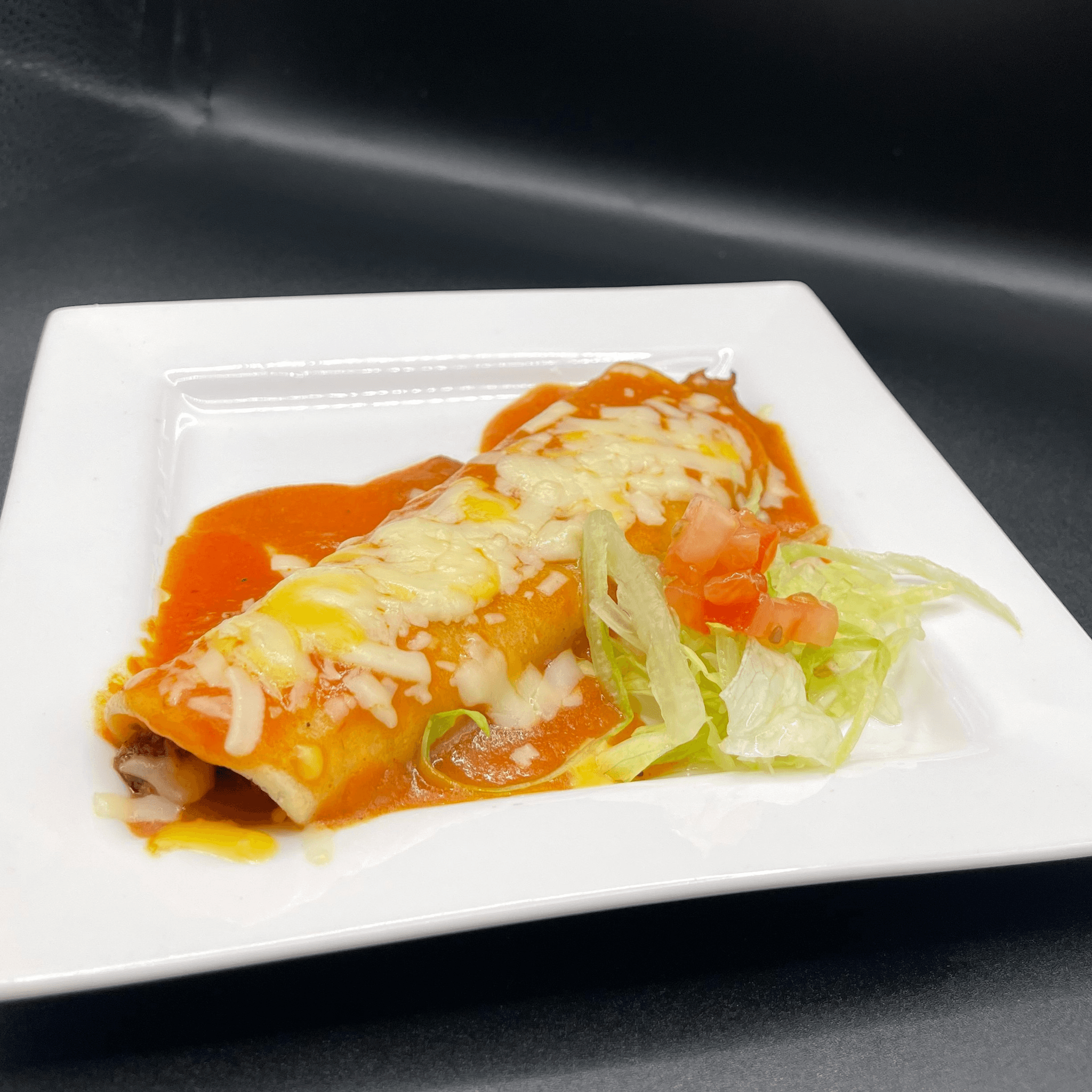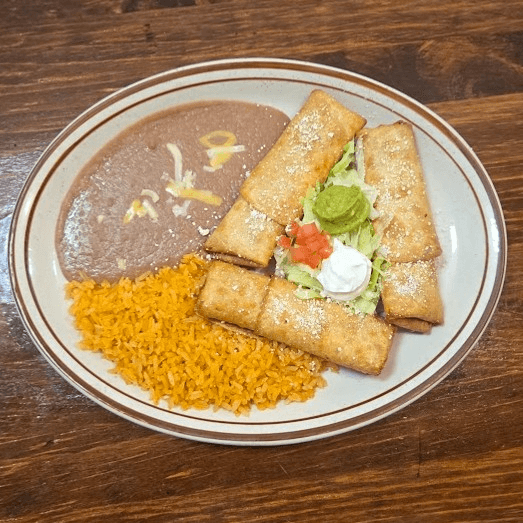 Two Flour Tortillas stuffed with Chicken and Monterey Jack Cheese, rolled and Fried Crispy. Garnished with tomatoes, Cojita Mexican Cheese, Sour cream and guacamole.