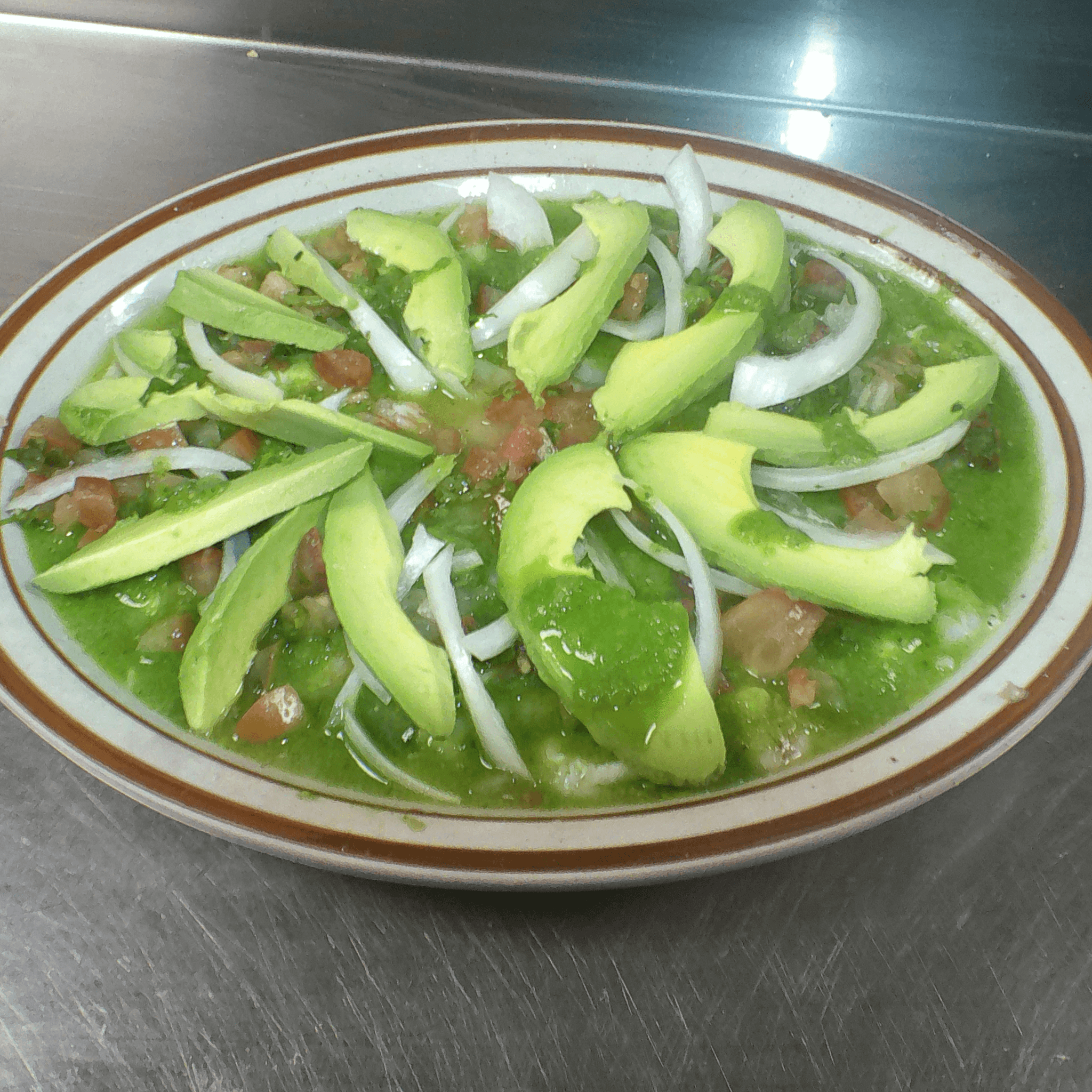 Shrimp cooked with lemon juice, avocado, cucumber, red onions, tomatoes, and jalapenos in sky green sauce.