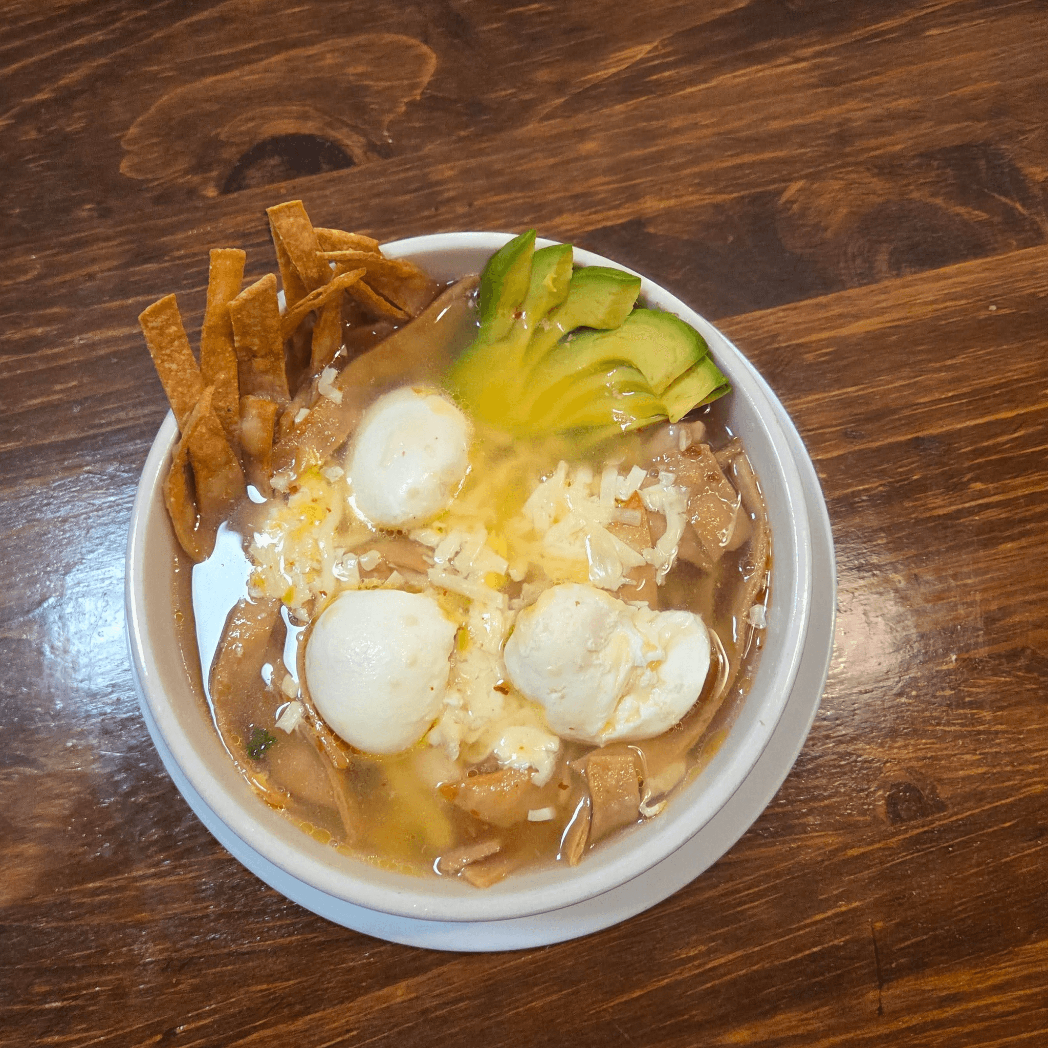 Hot and healthy chunks of tender chicken breast and fresh avocado are teamed up with tortilla strips, three eggs and shredded cheese in a rich chicken broth.