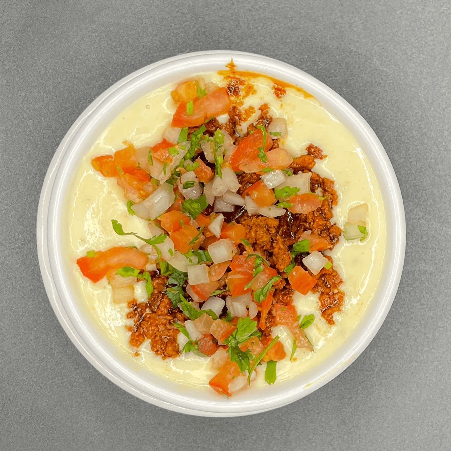 Cheese Dip with ground Beef ad Pico De Gallo.